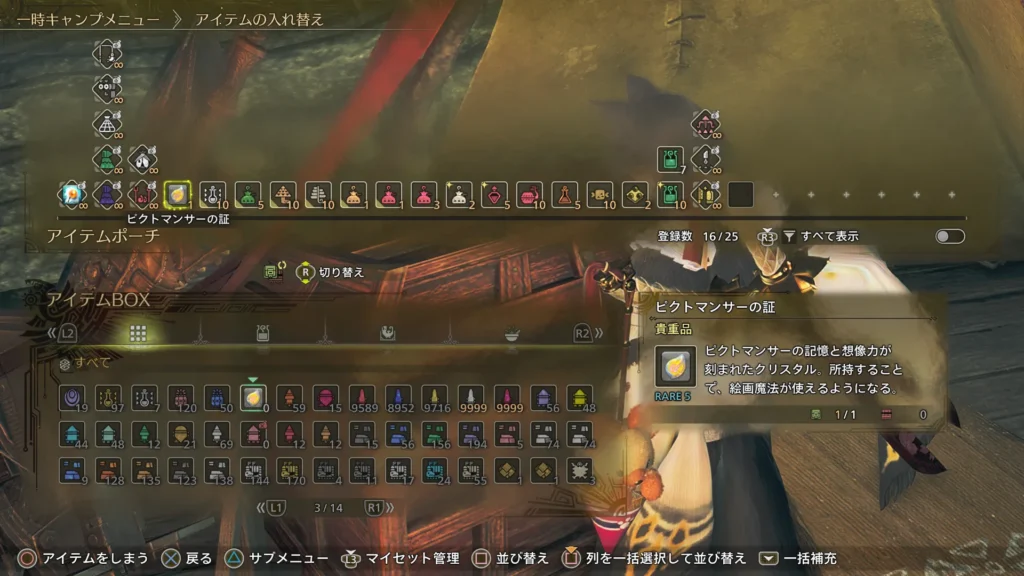 火力ソースになるピクトマンサーの証は確定枠、普段使いするアイテム以外に、攻撃力バフアイテム、秘薬(調合分含む)、生命の大粉塵(調合分含む)を持ってきています。