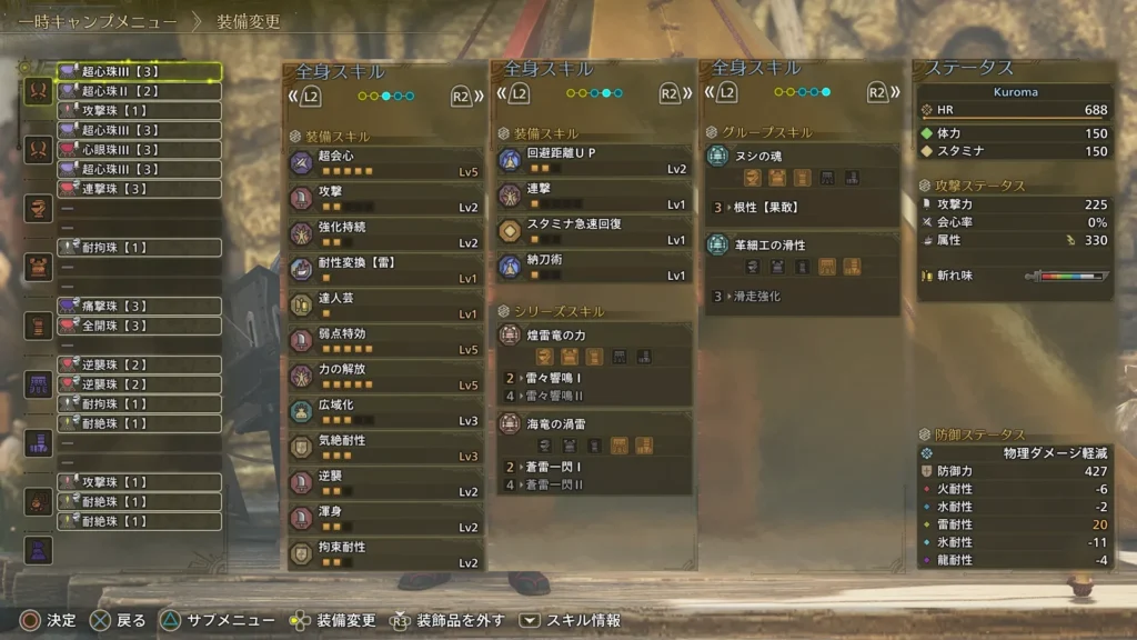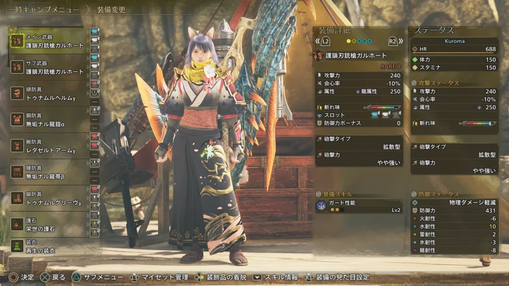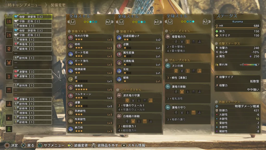 幸い管理人は砲術Lv3、属性変換Lv1、武1防1防1のお守りを持っていたので、これを使ってガンランス装備を組んでみた。