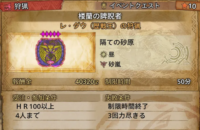 おすすめは歴戦王レ・ダウを狩猟するクエスト「楼蘭の睥睨者」を通常弾ライトで周回する方法です。