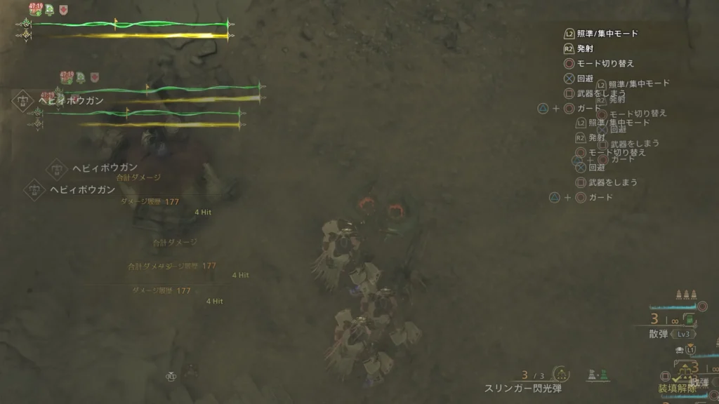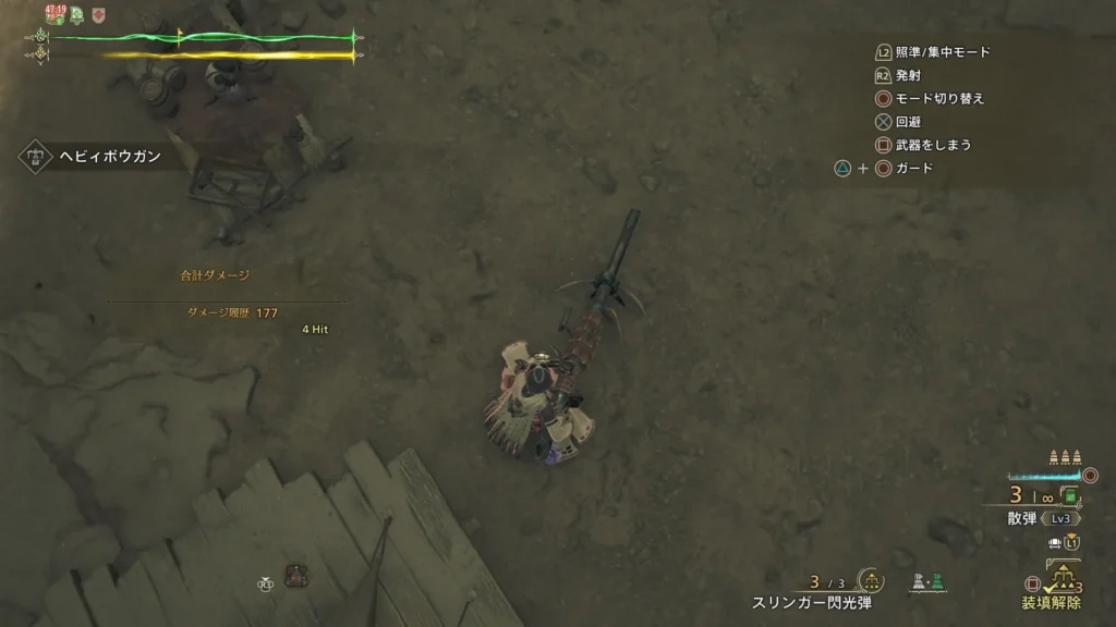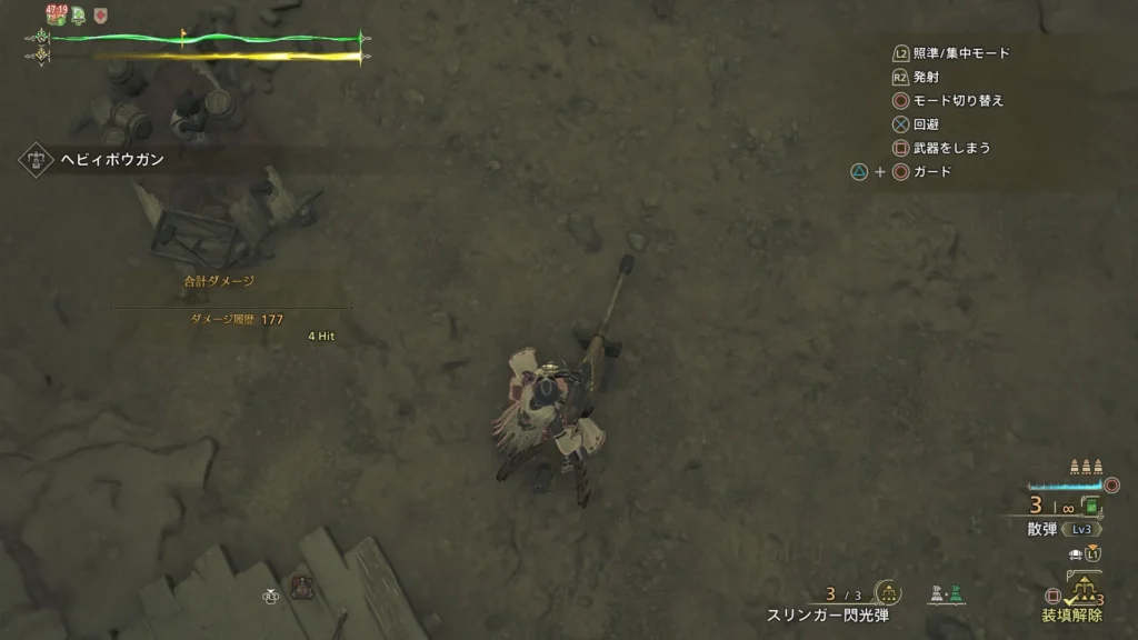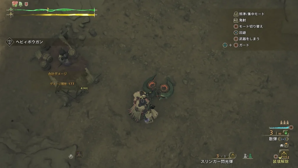 ボウガンの射程が変わる?みたいなので弾道強化Lv1込みの叛砲アルシャマリを用意し、Lv3散弾の射程を調べてみようと思います。