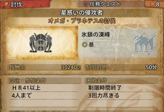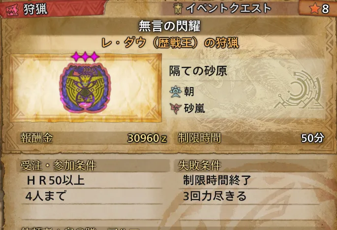 HR50以上で、常設されているイベントクエスト「無言の閃耀」に挑戦できます。