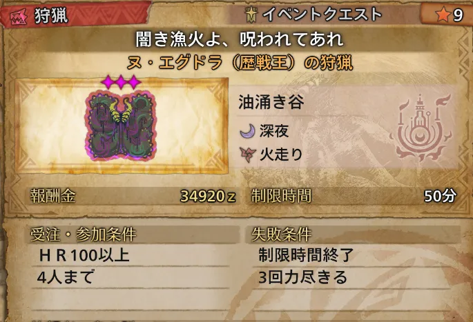 HR100以上で、常設されているイベントクエスト「闇き漁火よ、呪われてあれ」に挑戦できます。