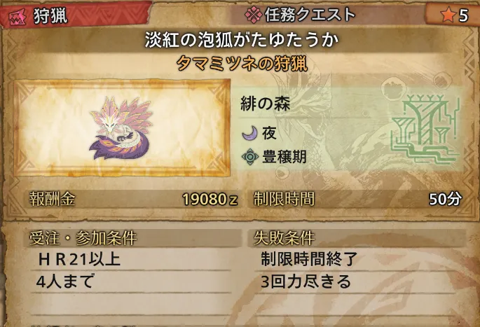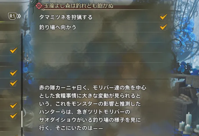 HR21以上で緋の森にいるカーニャに話しかけると、エクストラミッション1「玉藻よし森は釣れども飽かぬ」が開放されます。