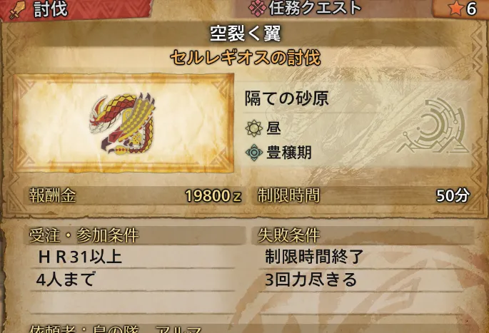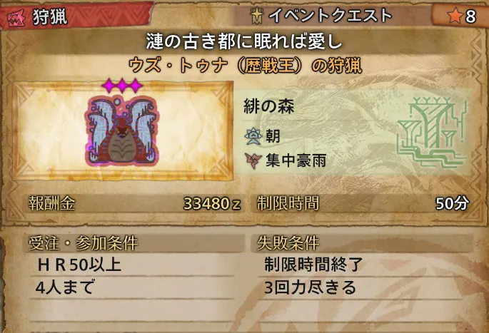 HR50以上で、常設されているイベントクエスト「漣の古き都に眠れば愛し」に挑戦できます。