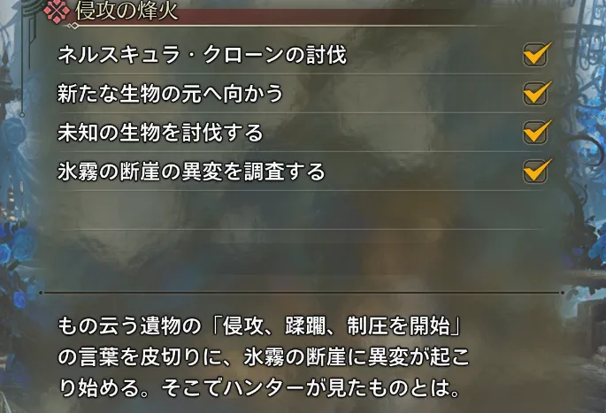 HR41以上の状態で氷霧の断崖にいるルロウに話しかけると、エクストラミッション4「侵略の烽火」が開放されます。