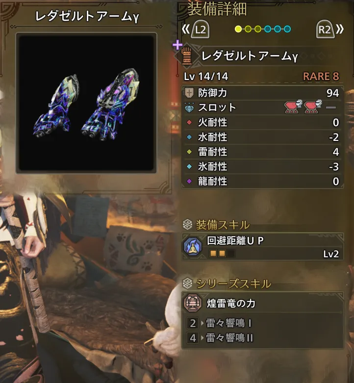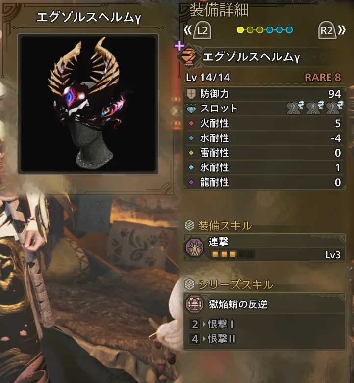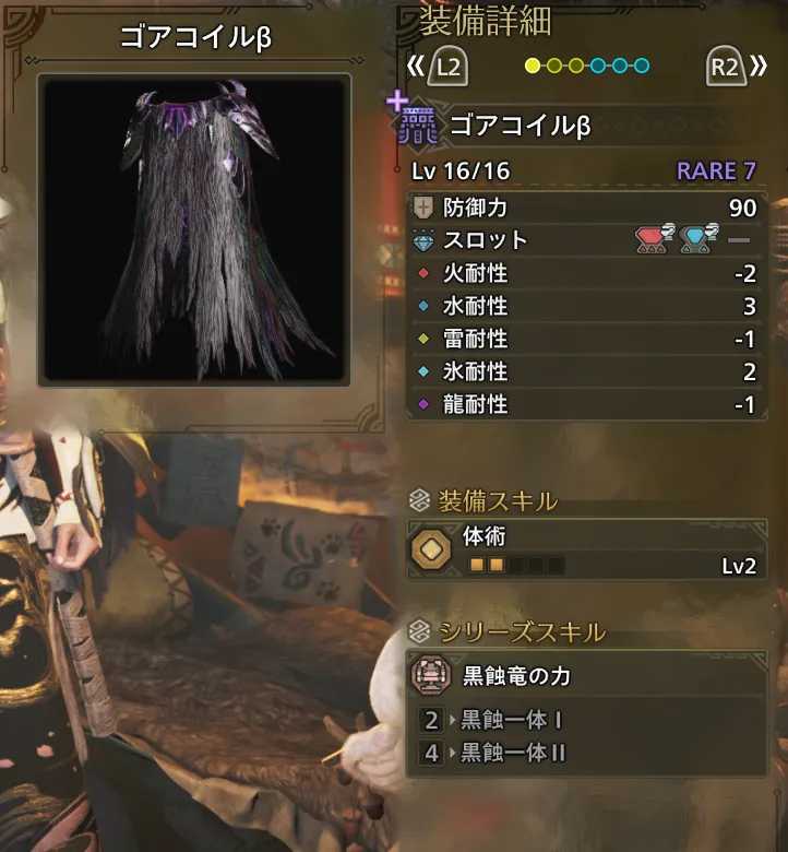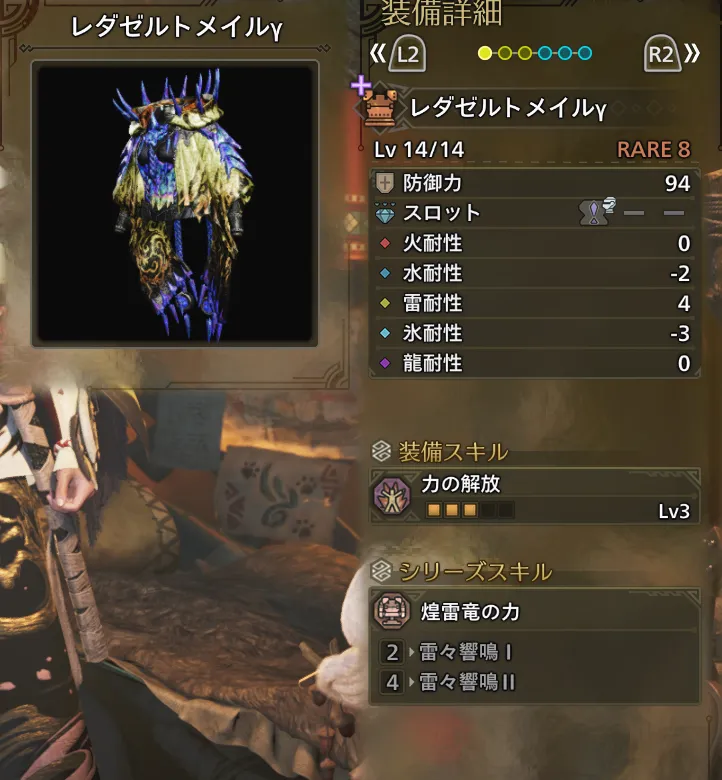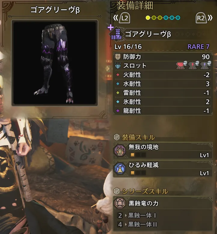 | 耐震Lv2 | 納刀術Lv1(おまけ) | ひるみ軽減Lv1 | 水場・油泥適応Lv1 |