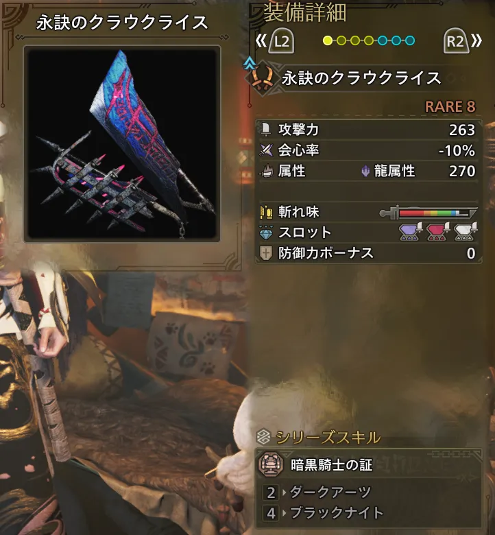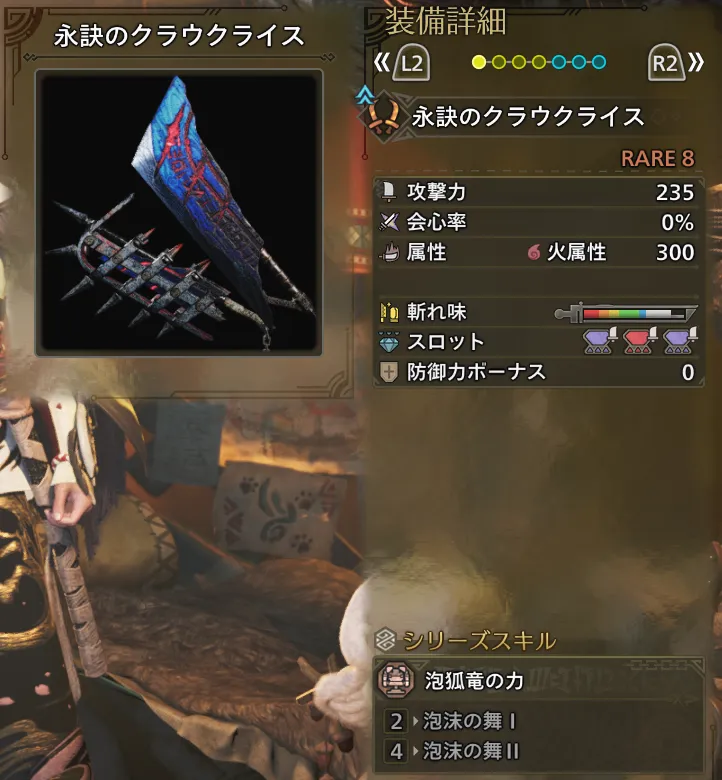 | サブ武器 | 超心珠Ⅲ【3】、破龍・属会Ⅲ【3】、匠珠Ⅲ【3】 |