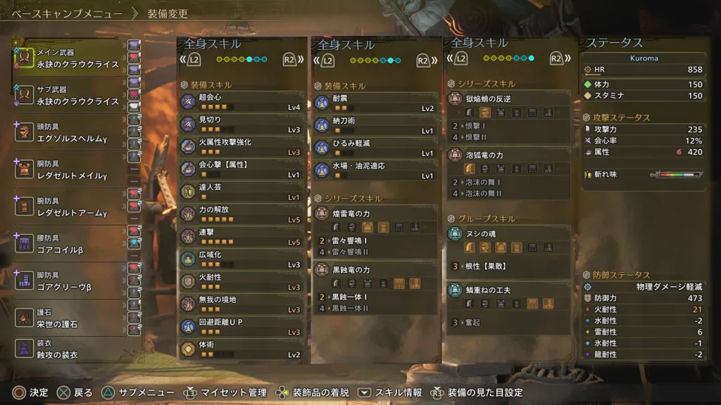 一般的な火力スキルに加え、武器スキルには武器の属性に対応した属性攻撃強化スキルを積んでいます。前述しましたがゴグマジオスは属性関連のギミックが多いので、それを発動させやすいようにしています。