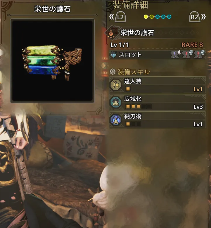 | 護石 | 達人芸Lv1、広域化Lv3(おまけ)、 納刀術Lv1(おまけ)、武1防1防具1 |