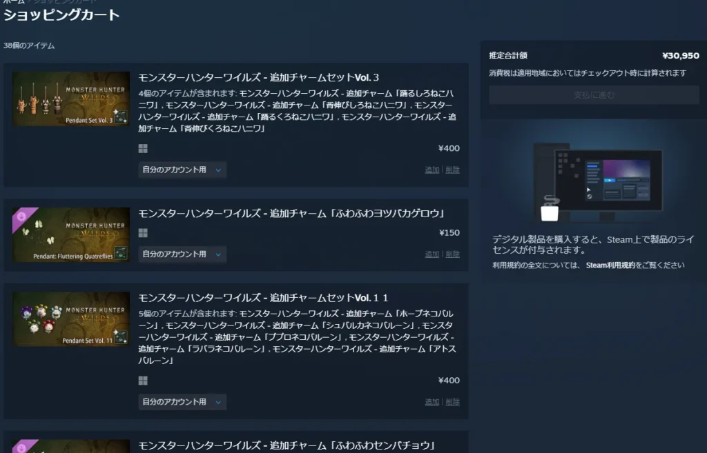 今回はシンプルに気になったのでワイルズのDLCを全部単発で買った際にいくらになるか見てみたいと思います。他意はありません。