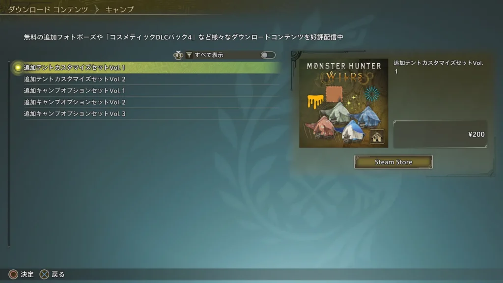 キャンプ用DLCはひとつ200円、それが5種類あります。