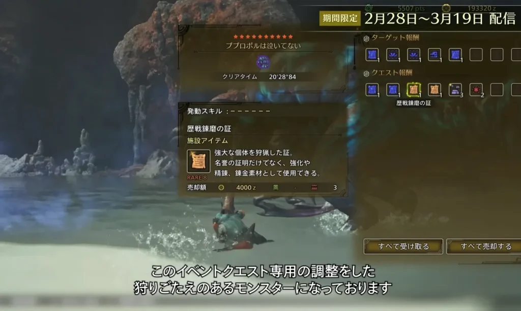 また、このモンスターは初の★10ランクのモンスターであり、レア度の高い鑑定護石が手に入りやすい古びたお守りや、巨戟アーティア武器の復元強化に使える歴戦錬磨の証が入手できます。