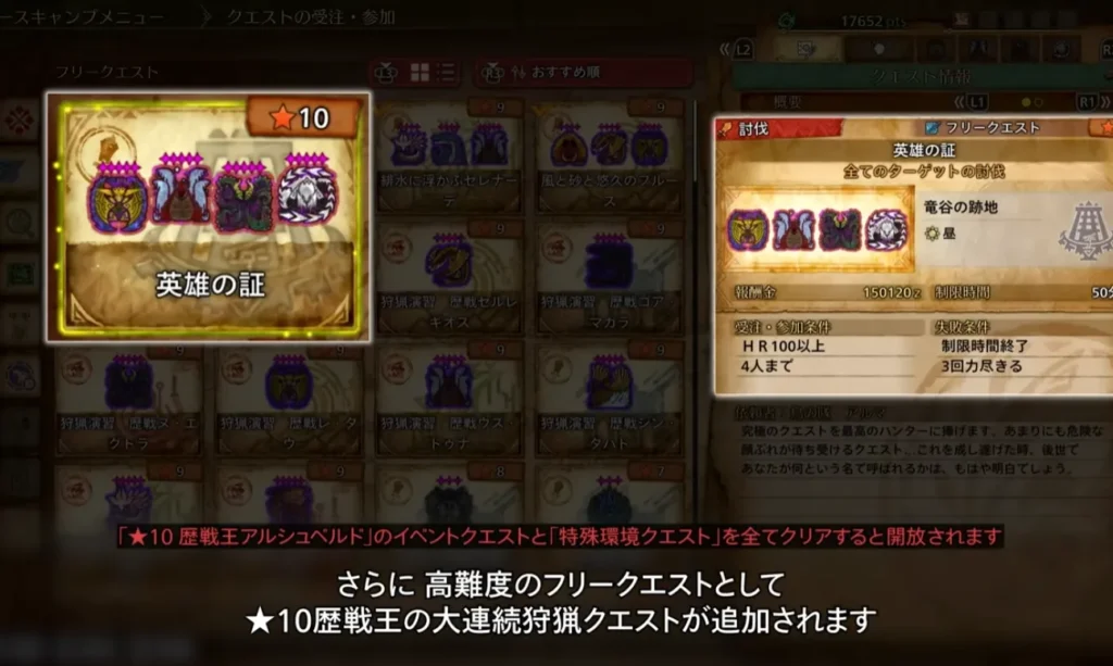 また、最高難易度のフリークエストとして、歴戦王レ・ダウ、歴戦王ウズ・トゥナ、歴戦王ヌ・エグドラ、歴戦王アルシュベルドを狩猟する★10クエスト「英雄の証」が実装されます。