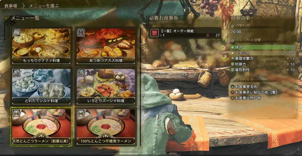 天然とんこつラーメン(創業以来)と100%とんこつ不使用ラーメンの2種類があり、それぞれ新しい食事スキルが発動するようになっています。