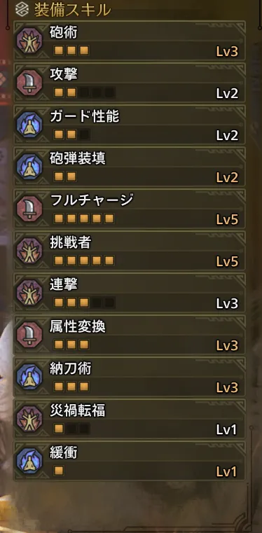 | フルチャージLv5 | 挑戦者Lv5 | 連撃Lv3 | 属性変換Lv3 |