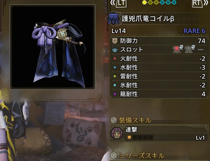 防具は加速再生Ⅰと属性変換Lv3を発動させるためにシュバルカヘルムβ、アームβ、グリーヴβを、超回復力Ⅰと挑戦者のLv確保のために、無垢ナル龍鎧β、龍帯βを採用した装備になっています。